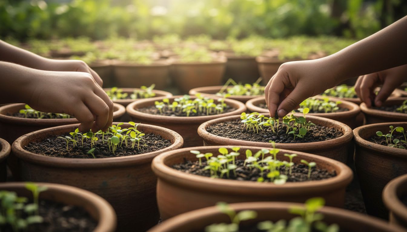 아이들이 흙을 만지작거리며 작은 씨앗을 심는 모습, 보기만 해도 마음이 따뜻해지지 않나요?